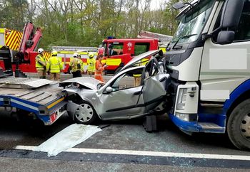 Police say the Citroen driver lost control and ended up balancing on top of a mound of earth