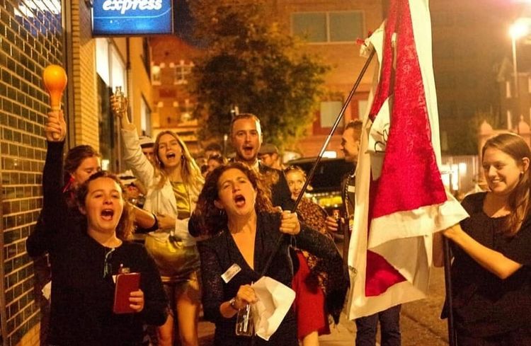 The evening commenced with a BYOB drinks reception, followed by a march around East London protesting for the preservation of worker’s rights. The group then returned to the gala for a two-course meal, during which there was much discussion of local gossip, as well as one character violently getting hit over the head with a bottle. Shortly after, that character was pronounced dead, to the shock and horror of the gala attendees. Thereafter a tour of the local pit was thrown in for good measure. The attendees were then invited to continue to enjoy the evening, partaking in a spot of roulette and many rounds of ‘who dunnit?!’.