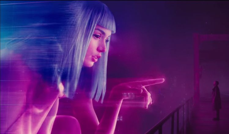 K lives in a small, brutalist apartment with his romantic love interest Joi (Ana de Armas). Joi is a holographic artificial intelligence, similar to Samantha in Spike Jonze’s “Her”. de Armas’ performance is excellent; capably inferring a great deal of heart and soul into what is essentially a computer-generated image, no mean feat. The film uses a visual motif that advertises Joi and how “she” will ‘tell you anything you want to hear’. This visual motif of their relationship adds a level of depth to K’s emotional journey and although he is a replicant and incapable of true human emotion this unzipping of K’s character has wider ramifications to the films central narrative.