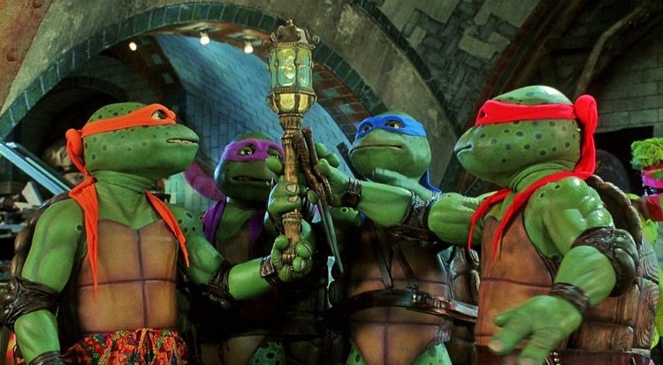 All this awfulness comes before we begin to discuss the articulation and voicing of the characters. The animatronics on the first two films were excellent, with particularly good articulation of the Turtles’ faces, so it was credible that they were talking. Here the mouths seem to have a reduced number of points of articulation, but what’s even more distracting is that they move in a staccato fashion. If the heads in the previous films managed to convey the illusion that the characters were talking, here the impression is very much one of watching someone offscreen pull wires, at least when the effort is even put in, there are many moments in which, though the Turtles faces are clearly visible, their mouths do not move at all. It’s not the sort of miserable low that the costumes for the Turtles’ live music tours (yes, those were a thing) would hit, but it’s a huge step down. The problem also extends to Splinter, whose voice sounds like a dad who doesn’t really do voices trying to do a Splinter impression to get his kid to go to sleep.