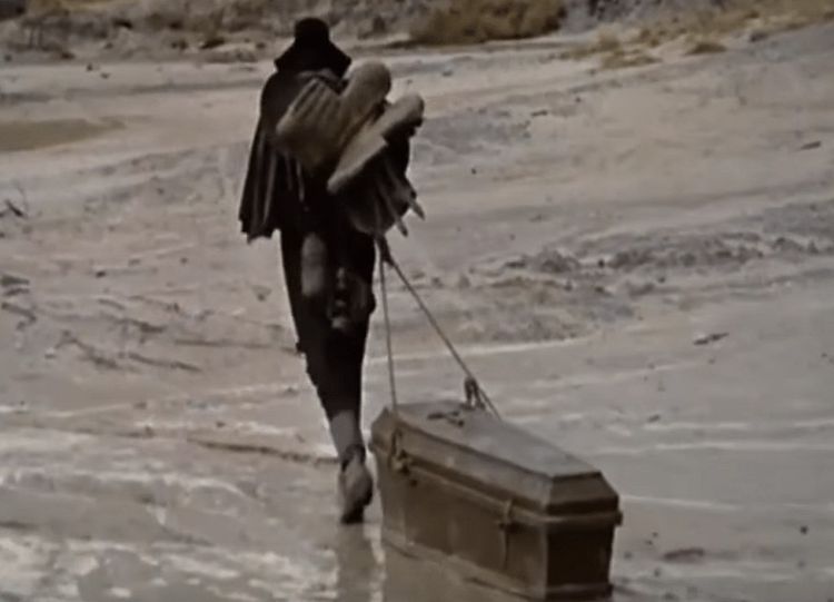 Unlike the heroes commonly associated with the west, Django is void of morality. He is no hero, but a tortured remnant of the civil war, dressed in a battered Union uniform. He does not ride into town bringing with him the promise of order and instead walks in (he is never on a horse throughout the film), dragging a heavy coffin which when first considered could hint at the symbolic weight he carries as a result of the murder of his wife, but later proves to simply to be a functional case in which to carry a heavy machine gun.