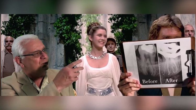 He even shared a cheeky smile with Princess Leia before turning round and superimposing Han Solo holding up a chart showing the before and after root canal treatment.