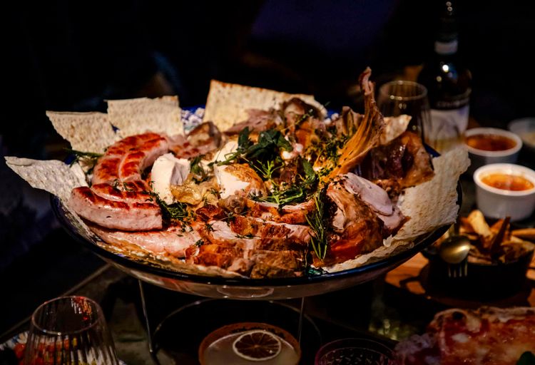 Sunday Roast Mains: Succulent roasted chicken, mouth-watering lamb shoulder, juicy pork sausages, baby suckling pig/baby goat roasts, and roast roots.