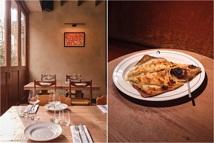 With a warm, earthy colour palette and abundance of natural light, Lita presents a timeless yet rustic dining room with reclaimed terracotta tile herringbone floor and exposed wooden joists across the ceiling. Upon entering the restaurant, guests are greeted by a large, timber-clad bar with deep red, veined marble top and a sprawling banquette in warm blood orange mohair fabric. Restored antique tables and chairs by Guillerme et Chambron furnish the space, along with cosy booth seating and stools dotted along the kitchen counter which is undoubtedly the main focal point of the space.
