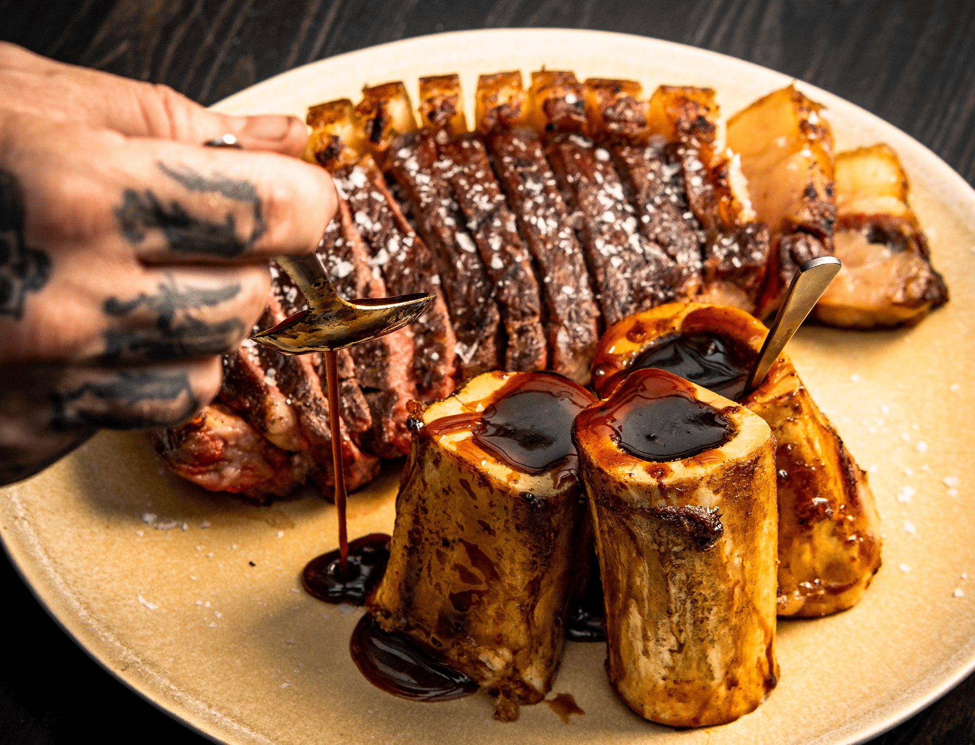 - 50-day-aged Beef Chop and Smoked Ox Cheek & Bone Marrow, with Malted-Whiskey Glaze, Roast Margherita Onions and Acme Pickles.