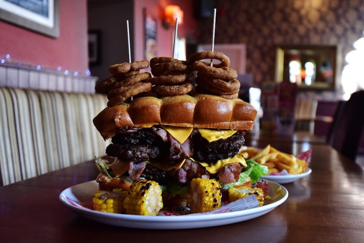 The ‘Apocolypse Cow’ challenge has eight flame-grilled beef burgers, eight rashers of streaky bacon, pulled pork, onions, cheese, lettuce and tomato.