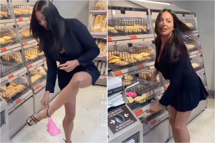 In the video, she can be seen removing her pink underwear and leaving them next to fresh bread items in a Mercadona supermarket in front of an astonished customer before walking off with a smile on her face.