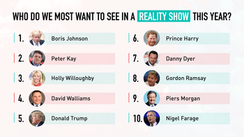Boris Johnson has been revealed to be the celebrity Brits most want to see in a reality show. A year after his father entered the jungle for I'm a Celebrity the outspoken politician topped a poll of the people Brits most want to see on screen. Peter Kay and new I'm a Celeb host Holly Willoughby came second and third respectively, with the former Apprentice star Donald Trump and David Walliams making up the top five. Piers Morgan and Nigel...