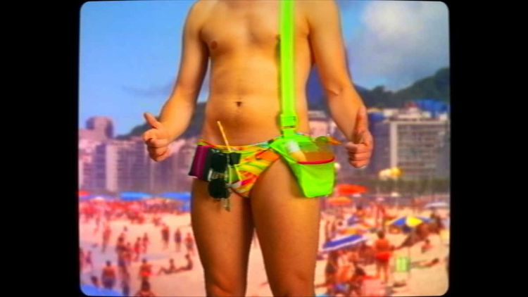 A JUNX-clad moustached male model is seen in a variety of cheesy seaside scenarios – squirting suncream on himself, drinking a cocktail, running down the beach Baywatch-style and making phone calls all in hands-free glory to highlight the ease of the neon trunks.