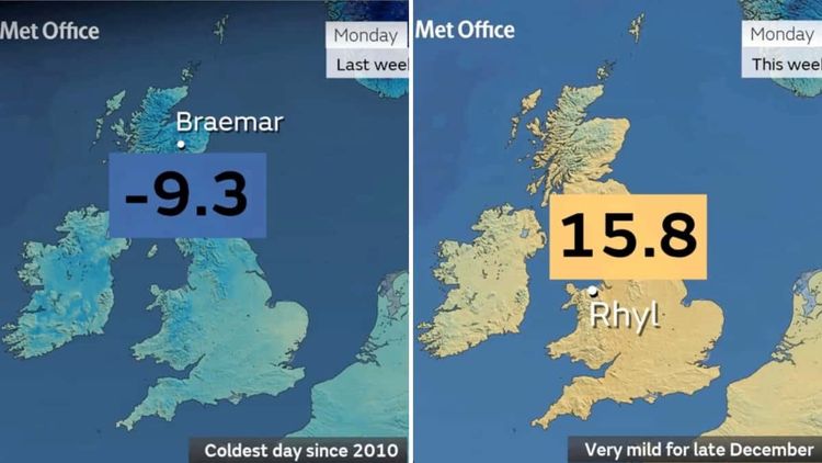 It comes after Braemar in Scotland saw a daytime high of minus 9.3C and a night-time low of minus 17.3C this time last week, while other places around the country experienced lows of minus 10C to minus 15C in the following days.