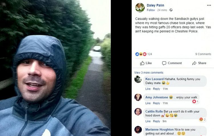It read: “Daley Smiths official day 156 on the run since he ripped his curfew off and said f*** you to the corrupt ****** up Cheshire Police force & justice system…fuck the courts they ain’t getting me in the dock, check the clock, tick tock, tick tock. Well not for 44 days anyway. Slight change of plan, (MY) official day 200 falls on Christmas Day, I’ll do my best to get there and then I’m gna set the internet on fire with a big party and then another party for new year. Ya’s ain’t ready!!! 44 days come on Daley lad. I’ve got this!!!”