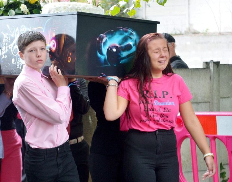 The children’s specially made coffins, including a pink Peppa Pig one for little Lia, were carried past in a horse-drawn carriage in age order, with oldest sibling Demi in front.