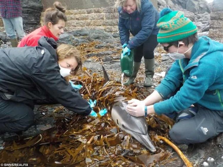 British Divers Marine Life Rescue medics, who attended the scene, said they arrived to find members of the public already looking after the trapped dolphin.