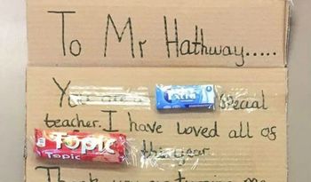 A teacher got a really sweet thank-you card from a pupil - made from chocolate wrappers. Year six teacher Rob Hathway was given the tasty farewell from a young girl leaving Watermore Primary School in Frampton Cotterell, South Glos,. A teacher got this really sweet thank-you card from a pupil - made from chocolate wrappers. She used the logos from to spell out her message which read: "To Mr Hathway, you are an EXTRA special teacher. "I have loved all...