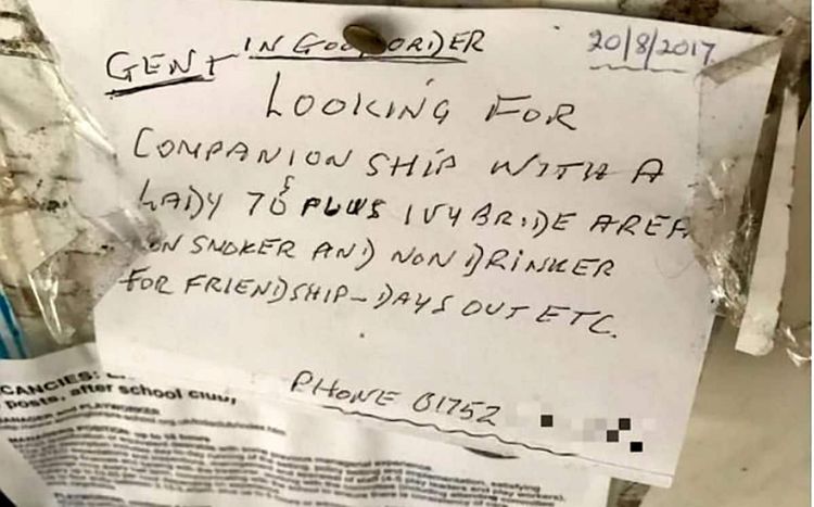 In a bid to find female companionship he asked a friend to post a note on the community board in Ivybridge, Devon.