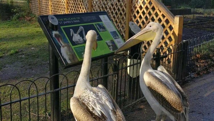 The sign reads: “Pelicans were first introduced to St James’s Park in 1664 as a gift from the Russian Ambassador to King Charles II.