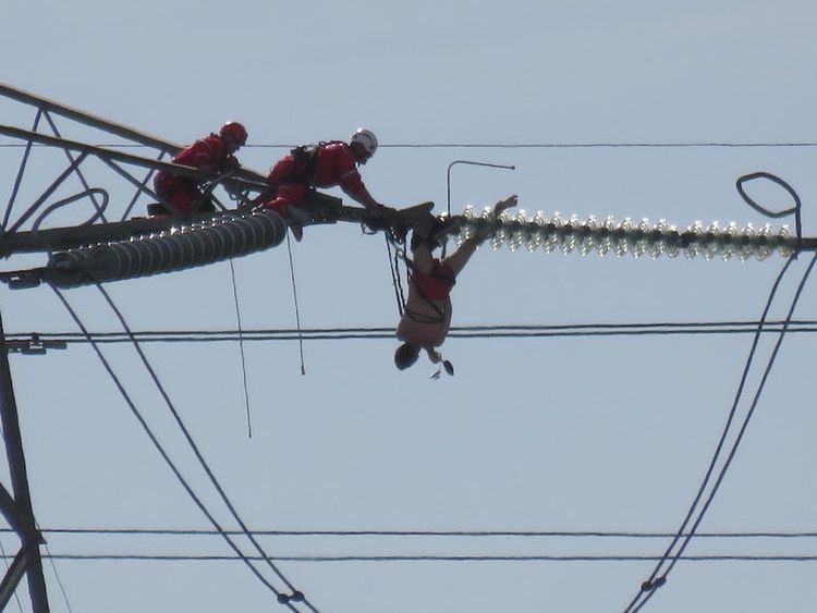 “The utility company shut off the electricity to the pylon and members of the Rope Rescue Team ascended the pylon, initially securing the casualty to prevent him falling, then administering medication provided by medical personnel at the scene.”