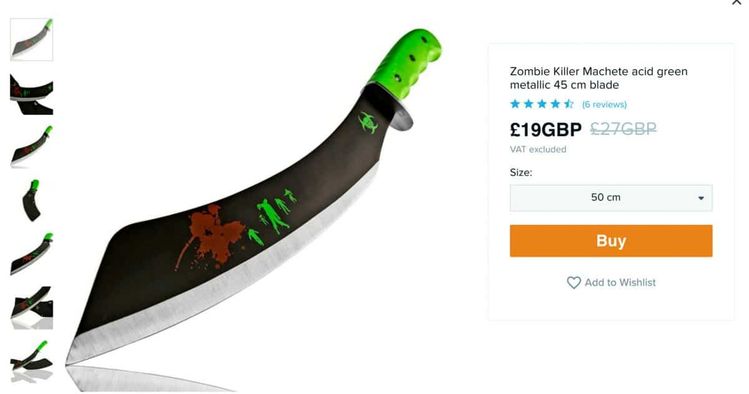 Scores of knives, many at discount prices, are up for sale at any one time – including a ‘Zombie Killer Machete’ for just £19.