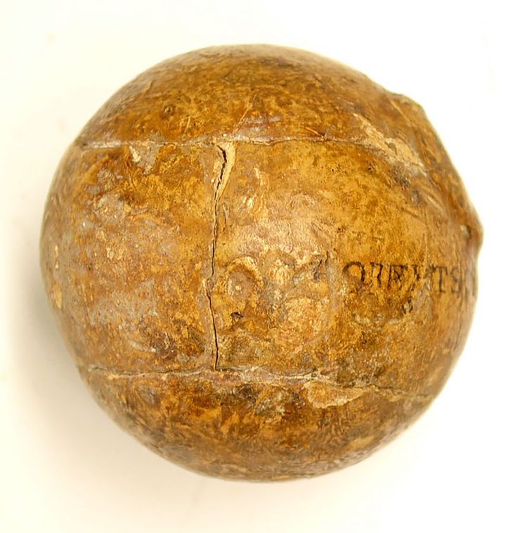 The leather ball, filled with feathers, was designed by Allan Robertson in the 1820s and is stamped with his name.