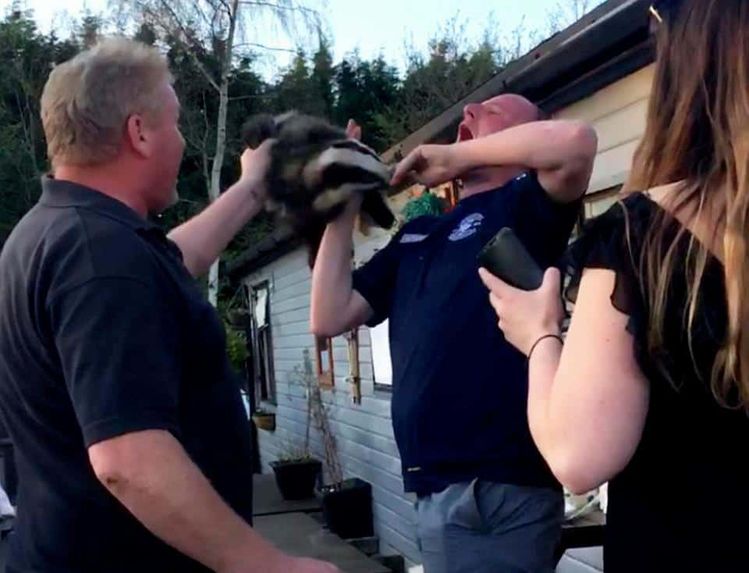 An angry badger bites down on a partygoer’s hand after he stupidly tried to pick it up at a BBQ. The animal can be seen clinging on as the man tries to shake it off.