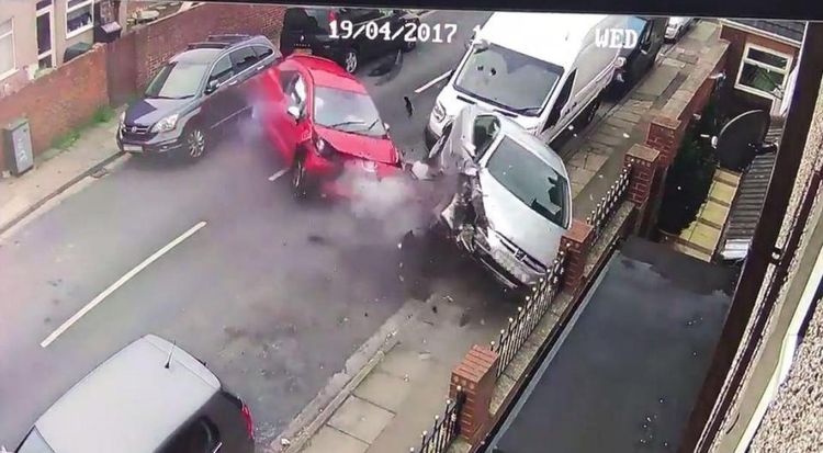 This is the moment an epic car smash was caught perfectly on CCTV before the occupants of the vehicle flee from the scene – with their dog. The footage captured a red Peugeot 308 ploughing into a silver car before spinning around 180 degrees and hitting three other vehicles – writing two of them off. But the dramatic CCTV images unbelievably spotted the driver sporting red shorts running away as a woman and another man clutching a dog also fled the scene.