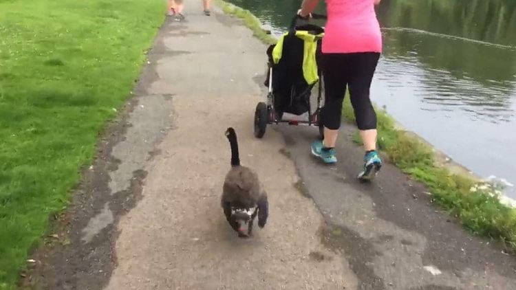 A goose has taken to stepping out with a local running club as they jog around a park lake.