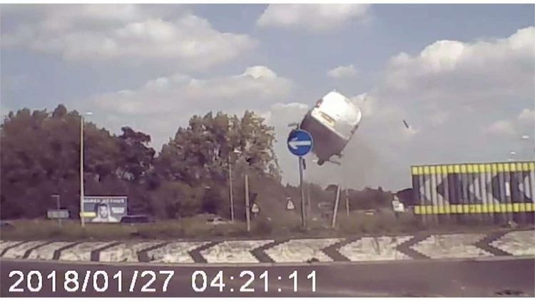 The silver Citroen van is caught hurtling along a dual carriageway before failing to stop and launching into the air as it strikes the cambered edge of the roundabout.