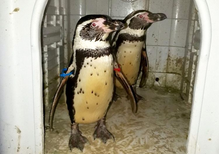 The pinched pair are Humboldt penguins – medium sized penguins which grow up to 70cm and 13lb.