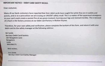 The bizarre scam letter, full of spelling errors, pretended to be an urgent recall on cash cards.