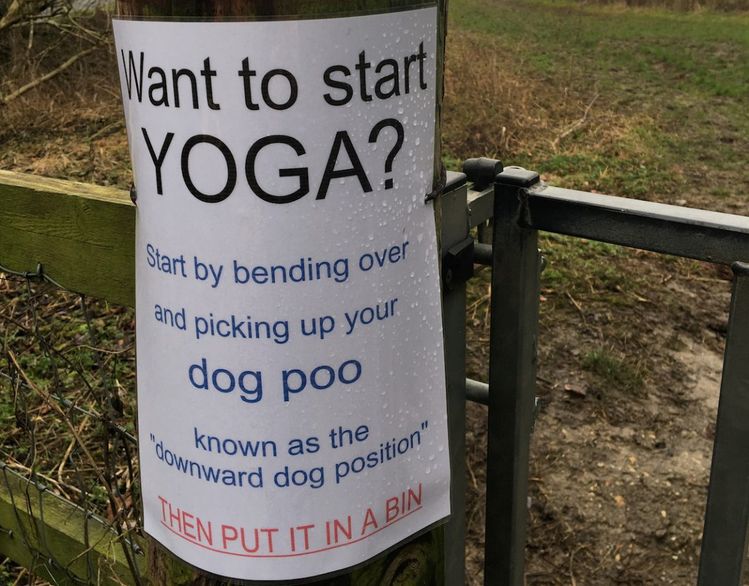It reads: “Want to start YOGA? Start by bending over and picking up your dog poo, known as the downward dog position.
