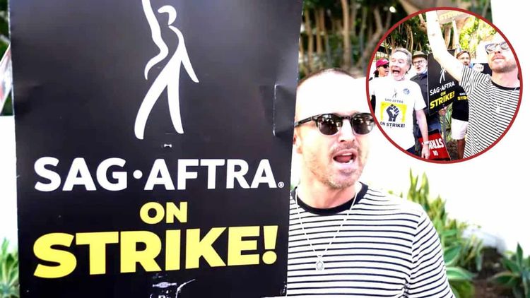 The US actor, 44, was joined by his Breaking Bad co star Bryan Cranston on a Los Angeles picket line as strikes by members of US actors union Sag-Aftra neared the 50-day mark.