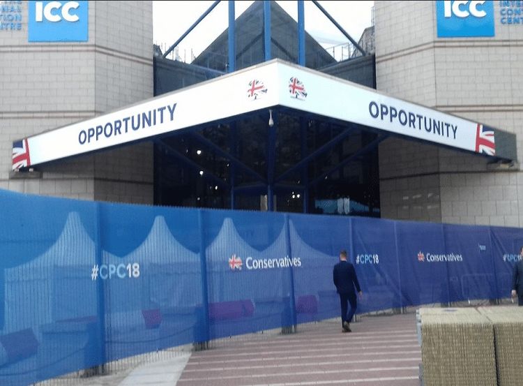 A barrier outside the Conservative Party Conference has been making the rounds on social media today ahead of the Conservative Party Conference.