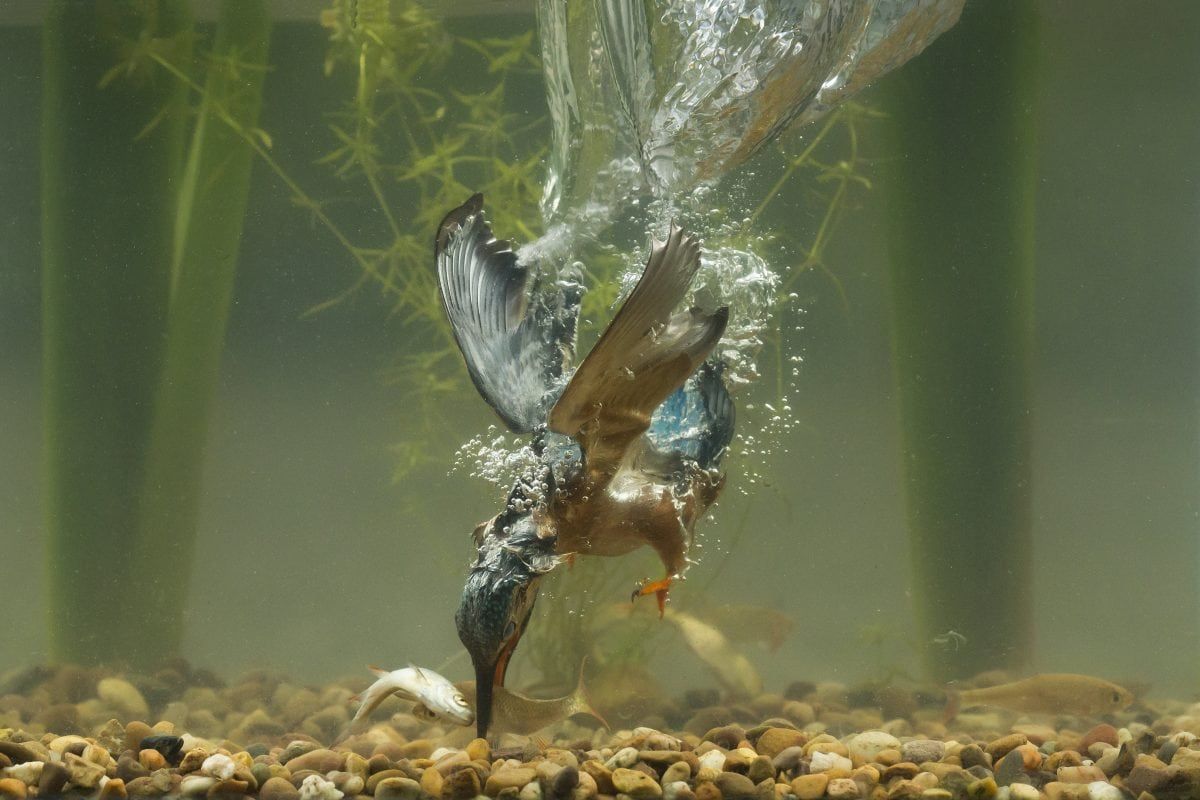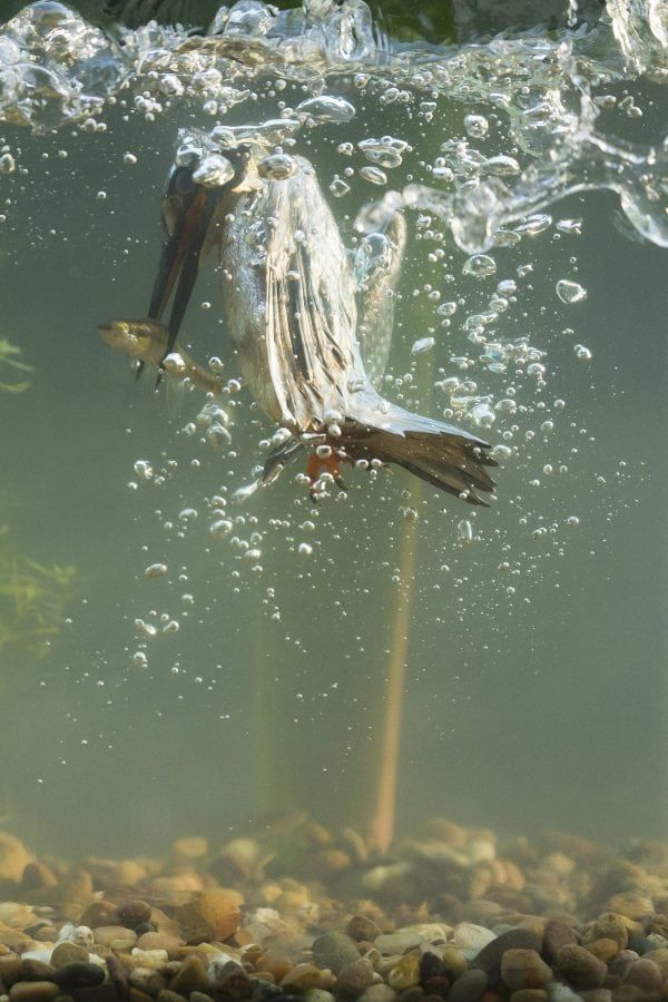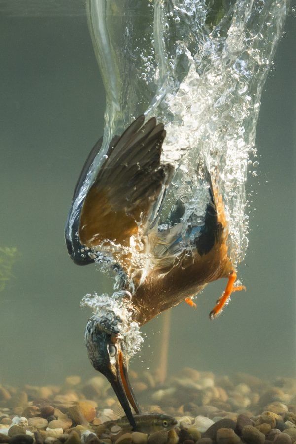 In this stunning sequence, the kingfisher can be seen piercing the surface of the water after spotting a fish on the river bed.