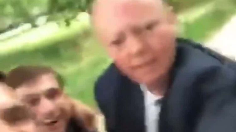 The two men shout “Oi oi” and “One photo please?” at Whitty, putting their arm around him as he tries to escape.