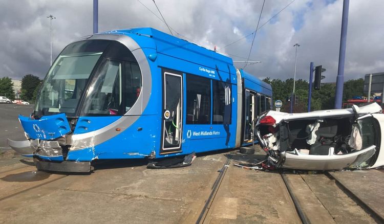 Shocking pictures show the mangled wreckage of the car and how the tram was derailed by the impact of the collision at the junction of the A41 and A454.