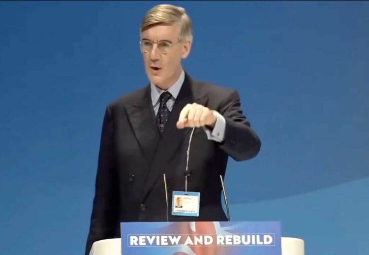 Sir Jacob Rees-Mogg spent part of his address to delegates at the Conservative Party Conference in Birmingham yelling at chairs as he tried to make a point about the “lefty use of language”.