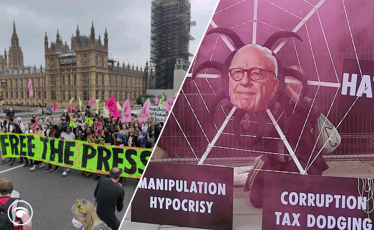 Extinction Rebellion shared photos and video on social media of “free the press” protesters marching through London and gathering in Parliament Square.