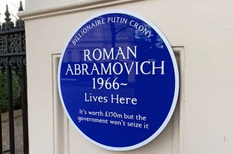 Blue plaques denoting ‘billionaire Putin cronies’ were placed on London properties, including that of Abramovich who owns a 15-bedroom mansion at Kensington Palace Gardens, which is valued at upwards of £150 million.