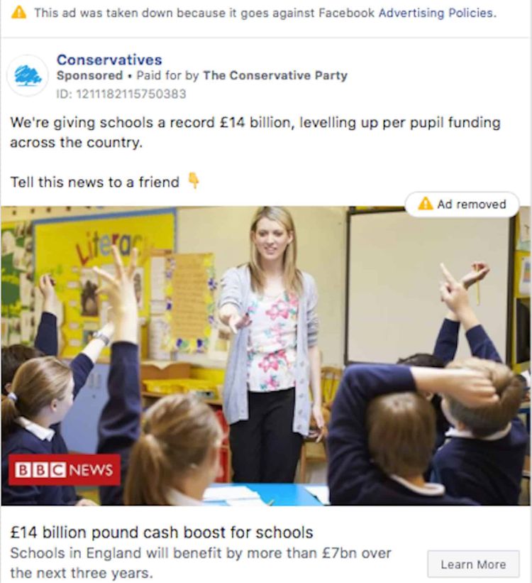 Fact-checking charity Full Fact uncovered ads which linked to a BBC News item which purported to have the headline “£14 billion pound cash boost for schools”.