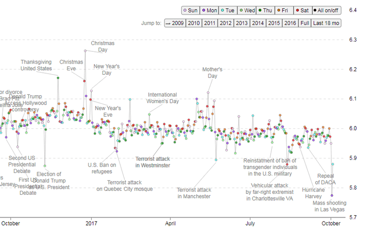 The reading was lower than the terrorist attack in Orlando last year and the bombing of Boston marathon, along with several high profile deaths.