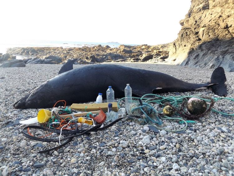 This shocking photo shows the devastation caused by rubbish thrown in the sea – a dead dolphin washed up in Britain surrounded by the waste which may have killed it,