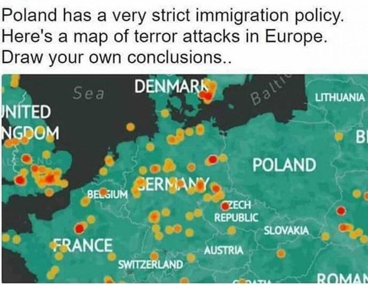 A terrorist map is doing the rounds on social media claiming that the reason Poland hasn’t suffered terrorist attacks is because of its strict anti-Muslim immigration policy – but it’s completely inaccurate.