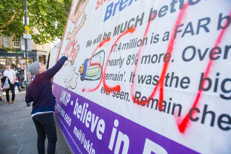 The incident took place in Bath, Somerset with the UKIP banners covered with words Scum and racist scum.