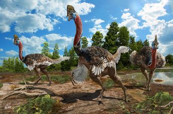 A flesh eating winged dinosaur that roamed Earth at the same time as T. Rex sported a spectacular head crest... which it used to woo the ladies. And it was a colourful beast with a blue face and unusually long, pink flamingo-style neck, according to an artist's impression. The weird new species had huge, razor-sharp claws and a stout but powerful toothless beak that ripped smaller animals apart. Looking like a giant turkey on stilts, it stood about 10 feet...