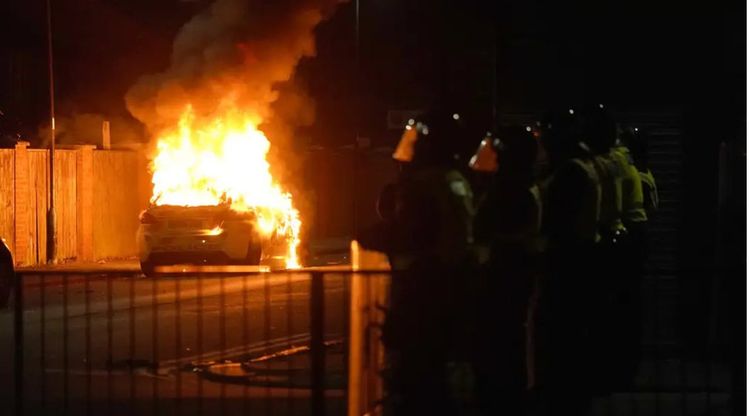 A police car burns as officers are deployed on the streets of Hartlepool following a violent protest (Owen Humphreys/PA)
