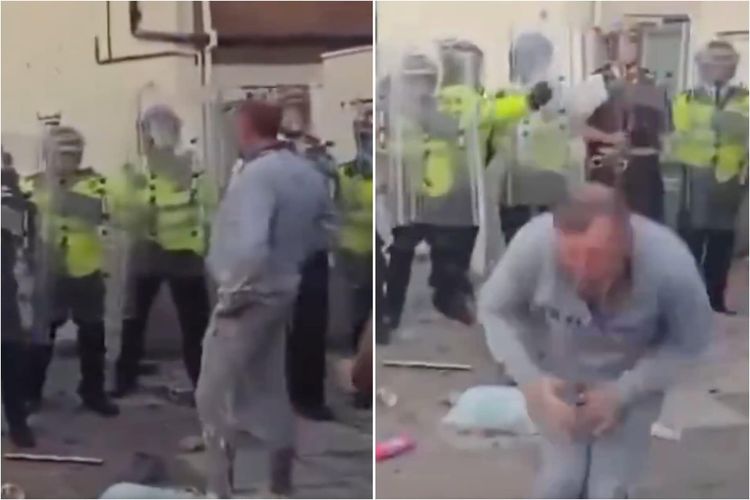 Social media users are sharing the glorious moment a rioter in Southport was pelted by objects as he taunted the police during protests.