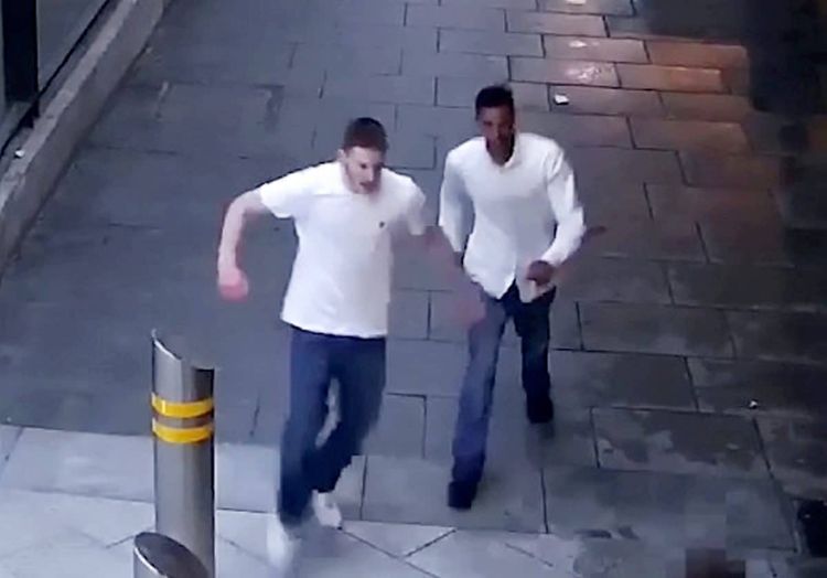 One of the suspects is even seen appearing to mime stabbing someone before doing a fist-bump with his pal before they bound away.