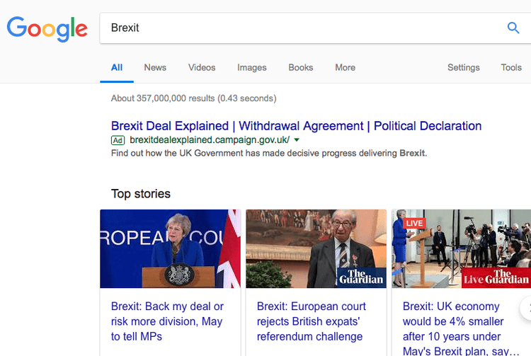 Type ‘Brexit’ or ‘Brexit deal’ into Google today and above any other search result is a Google advert that the government appears to be paying for with your money to sell Theresa May’s Brexit deal to you.