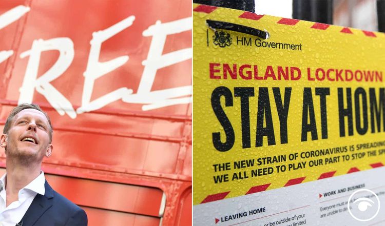 The controversial lockdown sceptic headed to the streets in the bus with a picture of a masked Winston Churchill statue on the side.