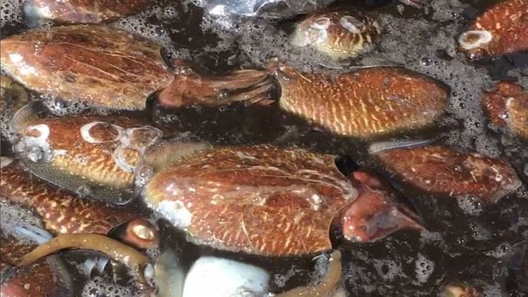 Mr Portus admits that the cuttlefish, though graceful and beautiful when swimming, can look a bit “disgusting” when dead, stacked up and splattered with the ink they squirt to confuse predators.